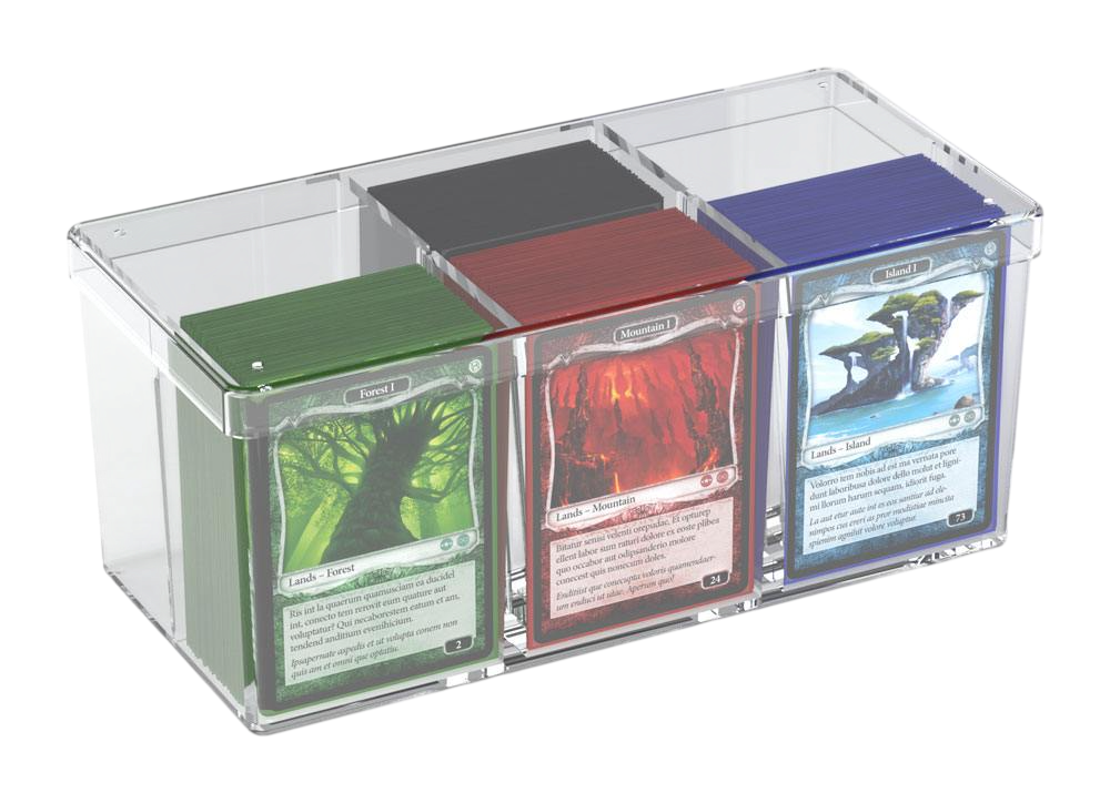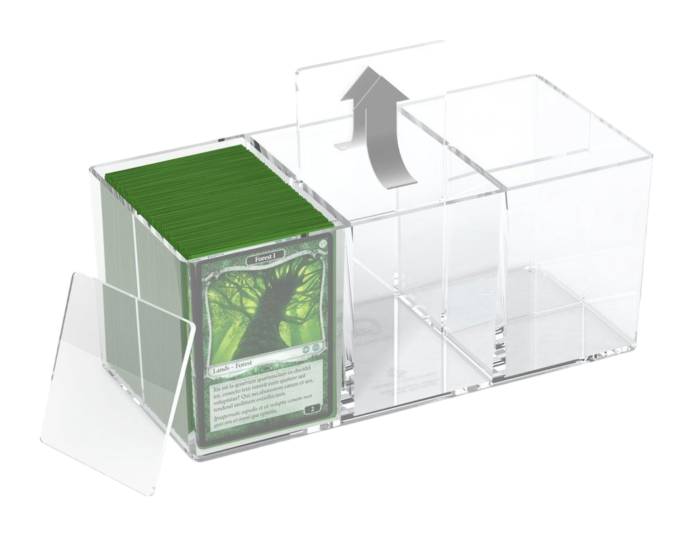 Fabriquée en polystyrène transparent haute clarté, elle accueille jusqu’à 480 cartes en pochettes (soit environ 930 cartes sans sleeves). Ses 6 compartiments égaux, associés à 3 intercalaires amovibles, permettent d’organiser facilement plusieurs decks ou collections.