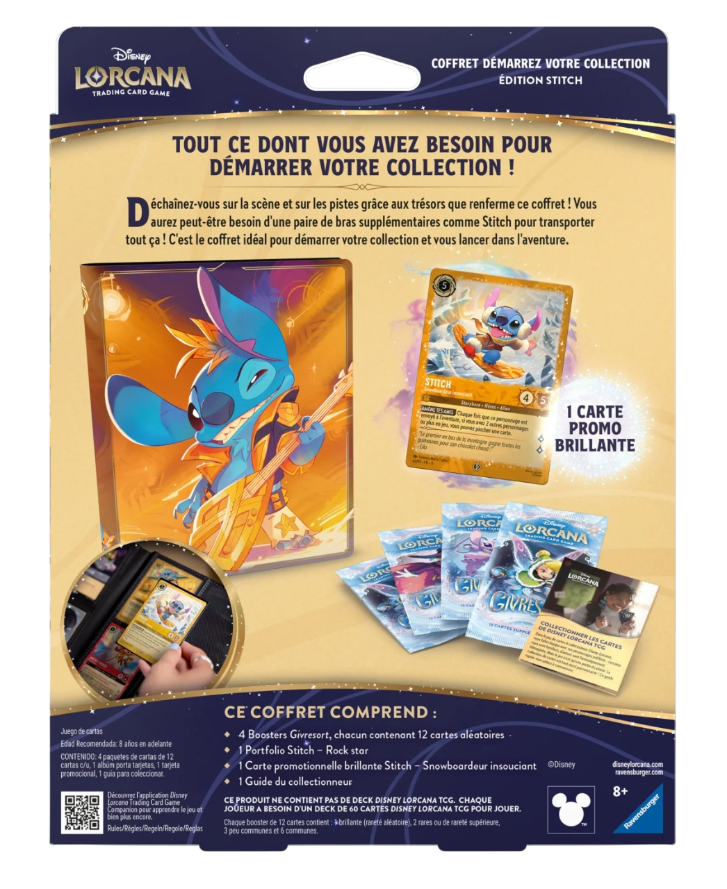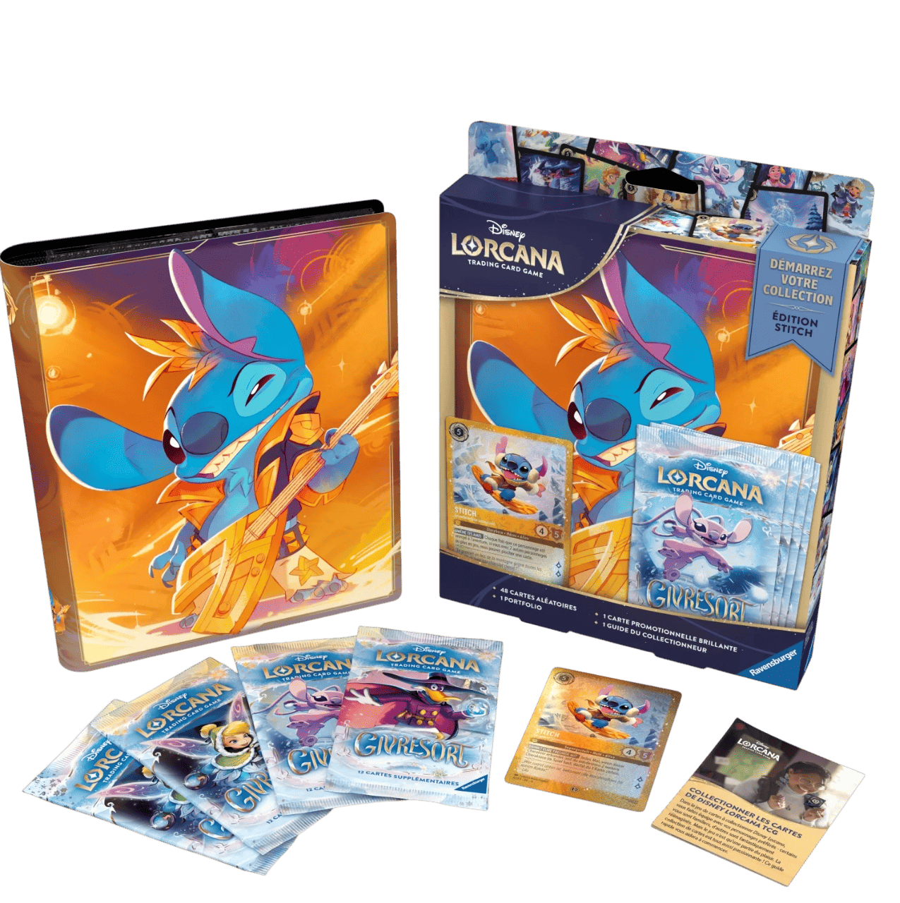 Stitch, Illumineur malicieux et iconique, apporte une touche chaleureuse à ce coffret qui combine tirages aléatoires, exclusivité et accessoires élégants. Le portfolio illustré permet de conserver vos cartes préférées, tandis que le guide du collectionneur vous accompagne pour mieux comprendre les encres, les raretés et les stratégies de base.