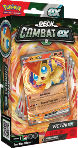 Deck Combat-Ex officiel Pokémon – 60 cartes prêtes à jouer, 1 carte promo brillante (Victini-ex, Démolosse-ex, Amphinobi-ex ou Forgelina-ex), accessoires et code TCG Live.