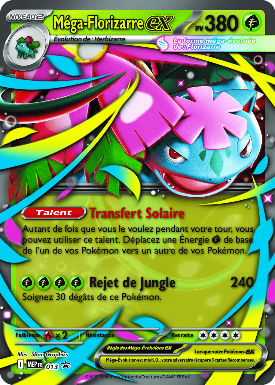Méga-Florizarre ex signe un retour remarqué grâce à son talent Transfert Solaire, une capacité stratégique redoutable permettant de déplacer vos Énergies Plante comme bon vous semble et d’optimiser vos attaques. Idéal pour renforcer vos decks ou enrichir votre collection avec des cartes recherchées.