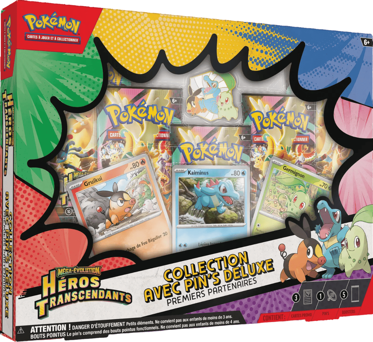 Vous retrouverez ces trois Pokémon sous forme de cartes promo brillantes exclusives, accompagnées d’un pin’s Deluxe en métal représentant le trio. Le coffret inclut également 5 boosters de l’extension spéciale ME2.5 – Héros Transcendants, dédiée à la Méga-Évolution.