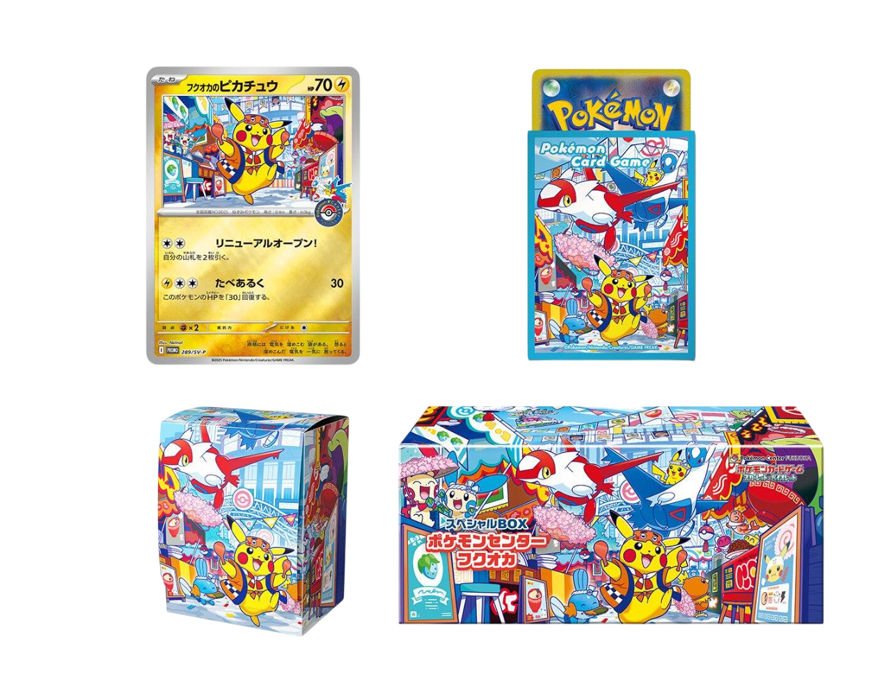 Disponible uniquement via tirage au sort au Japon, il met en vedette un Pikachu brillant inspiré des festivals gastronomiques. La carte promo Fukuoka Pikachu – SV-P 289 et les accessoires assortis en font une pièce unique pour les collectionneurs.
