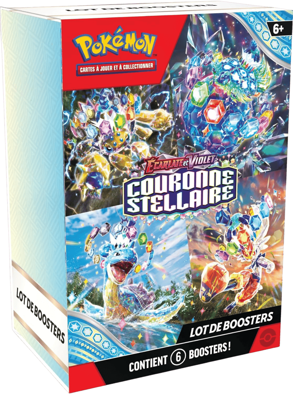 Réveillez le pouvoir qui sommeille en vous avec l’extension Couronne Stellaire. Dans les profondeurs d’un monde souterrain se déchaînent les forces étincelantes de la Téracristallisation. Légendaire et resplendissant, Terapagos trône aux côtés de puissants Pokémon-ex comme Pyrobut-ex, Lokhlass-ex ou encore Mygavolt-ex. Ce bundle de 6 boosters vous plonge dans cette nouvelle extension qui introduit également Pomdorochi-ex et renforce la place des cartes HIGH-TECH dans le jeu. Une aventure stratégique et visuelle à ne pas manquer pour collectionneurs et joueurs confirmés.