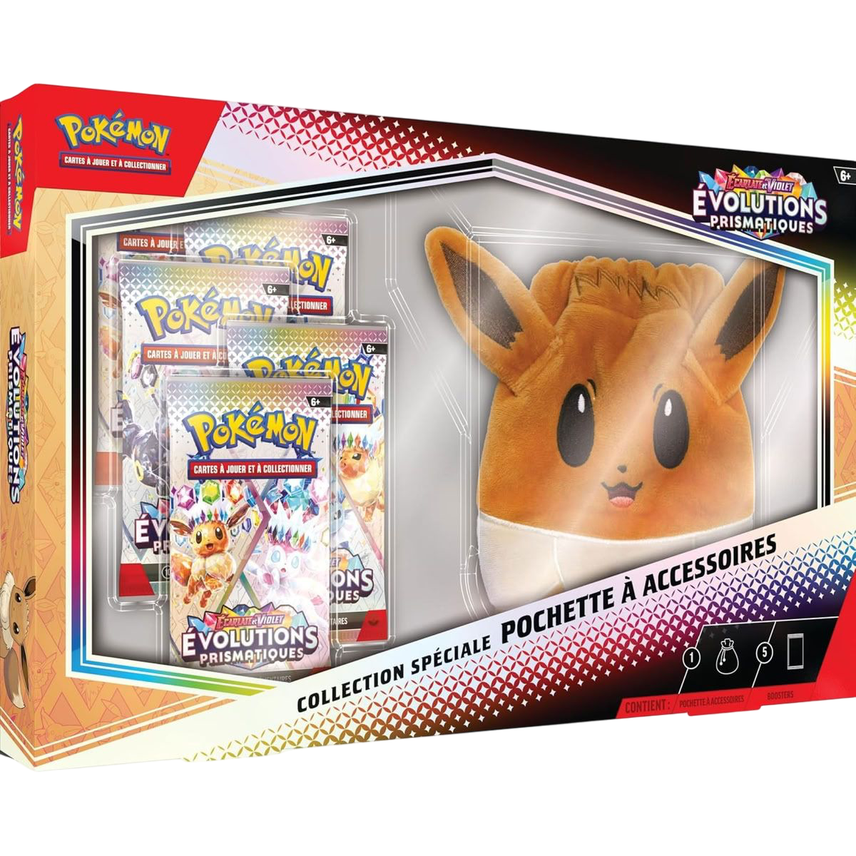 Coffret Pokémon avec une pochette douce à l’effigie d’Évoli + 5 boosters de l’extension Évolutions Prismatiques (Écarlate & Violet). Idéal pour protéger ses cartes et enrichir sa collection.