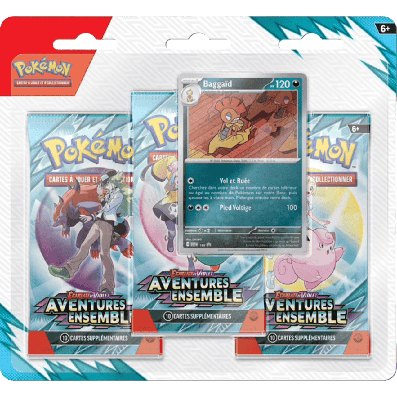 Tripack Aventures Ensemble EV09 avec 3 boosters, 1 carte promo exclusive (Baggaïd ou Yanmega) et des cartes brillantes pour renforcer votre collection.