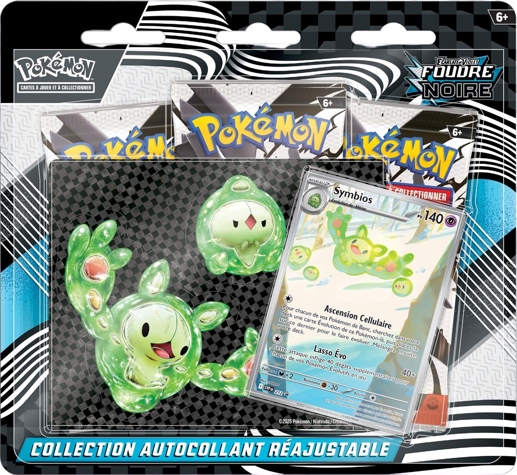 La Collection Autocollants Tech – Foudre Noire met à l’honneur Symbios, le Pokémon Multiplicateur, avec une carte promo brillante exclusive. Cette carte stratégique peut faire évoluer tout votre Banc en un tour, ajoutant une nouvelle dimension tactique à vos parties. En plus de la carte promo, vous trouverez une planche d’autocollants au design tech, représentant la lignée évolutive complète : Nucléos, Méios et Symbios.