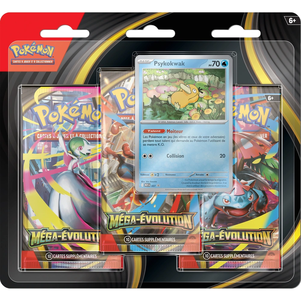 Avec ce Tripack Méga-Évolution, l’aventure Pokémon prend une toute nouvelle dimension ! Ce coffret contient 3 boosters Méga-Évolution (ME01) et une carte promo brillante exclusive au choix : Psykokwak ou Akwakwak.