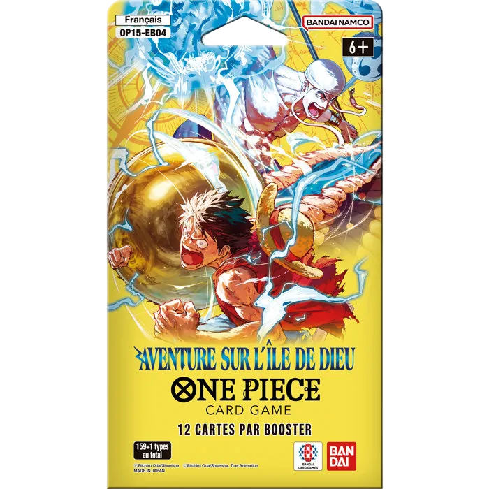 Booster One Piece Card Game OP15 — Aventure sur l’Île de Dieu. Découvrez l’extension centrée sur l’arc Skypiea avec 12 cartes par booster, incluant cartes rares, alternatives et potentiellement Manga.